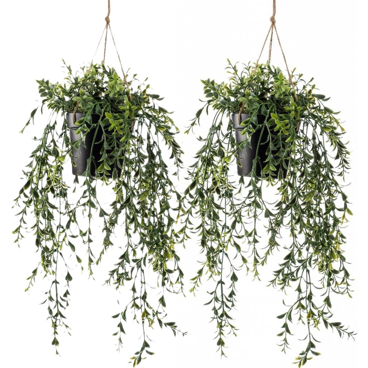 2x emerald kunstplant hangplant Buxus in de kleur groen, in pot. Afmeting: 50 cm. Deze mooie kwaliteit kunstplant is prachtig om overal op te hangen, alleen of in een groepje op verschillende hoogtes. Het voordeel van dit hangende kunstplantje, is dat deze geen water nodig heeft, en het hele jaar door prachtig groen blijft! Dus zeer geschikt voor iedereen die niet beschikt over een stel groene vingers. Goed toe te passen in donkere ruimtes waar weinig daglicht komt, zoals de badkamer of toilet.